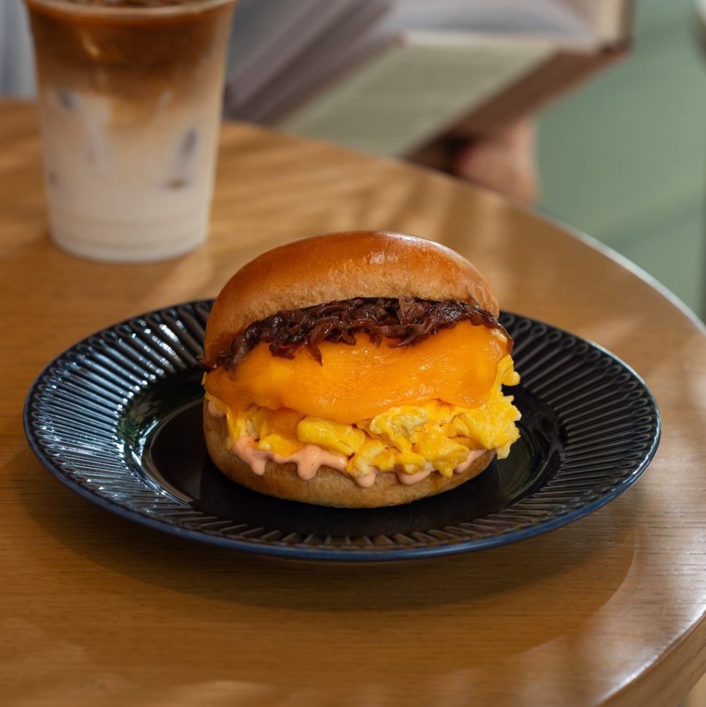 SCRAMBLED EGGS WITH CHEDDAR CHEESE, CARAMELIZED ONIONS SRIRACHA MAYO SAUCE, SERVED IN A BRIOCHE BUN.