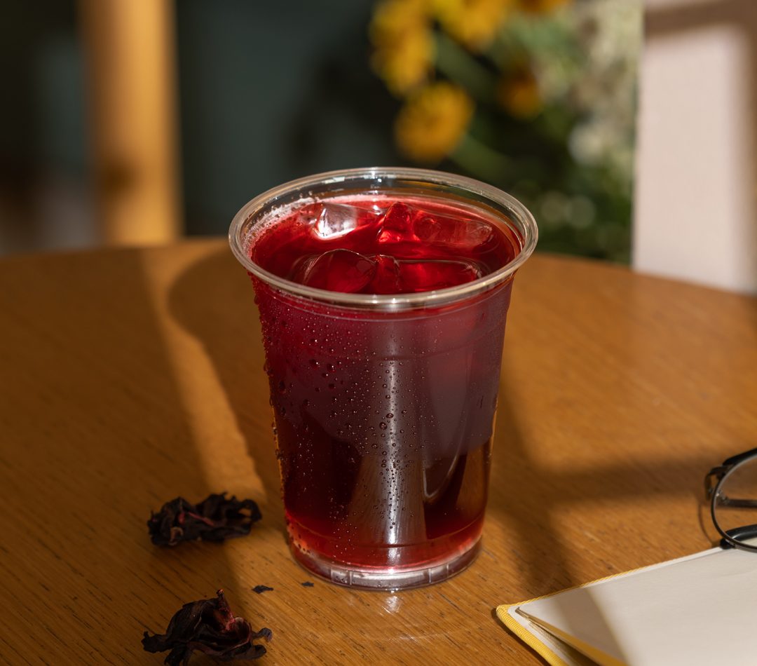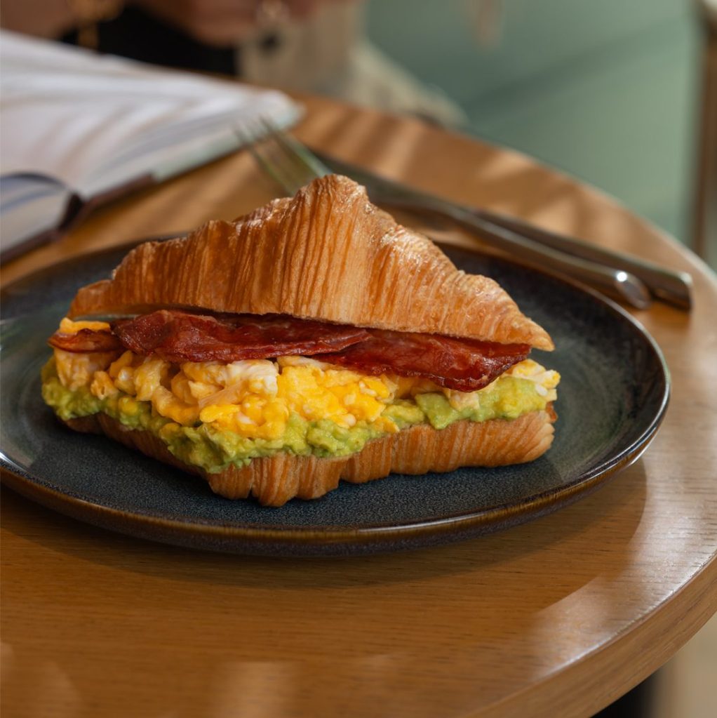 SCRAMBLED EGGS, SMASHED AVOCADO, BEEF BACON, SERVED IN A CROISSANT.