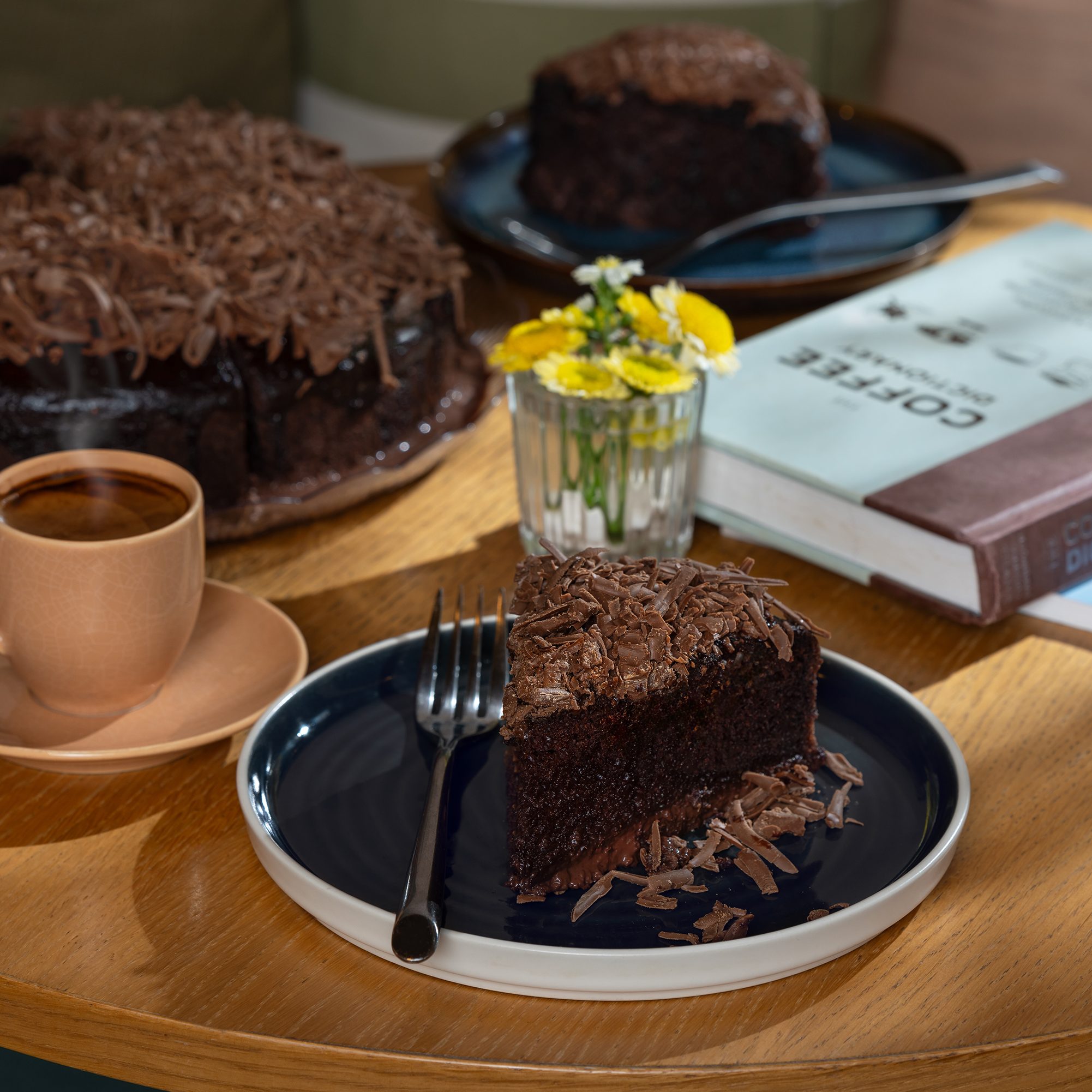MOIST CHOCOLATE CAKE, TOPPED AND DRIZZLED WITH CHOCOLATE FLAKES