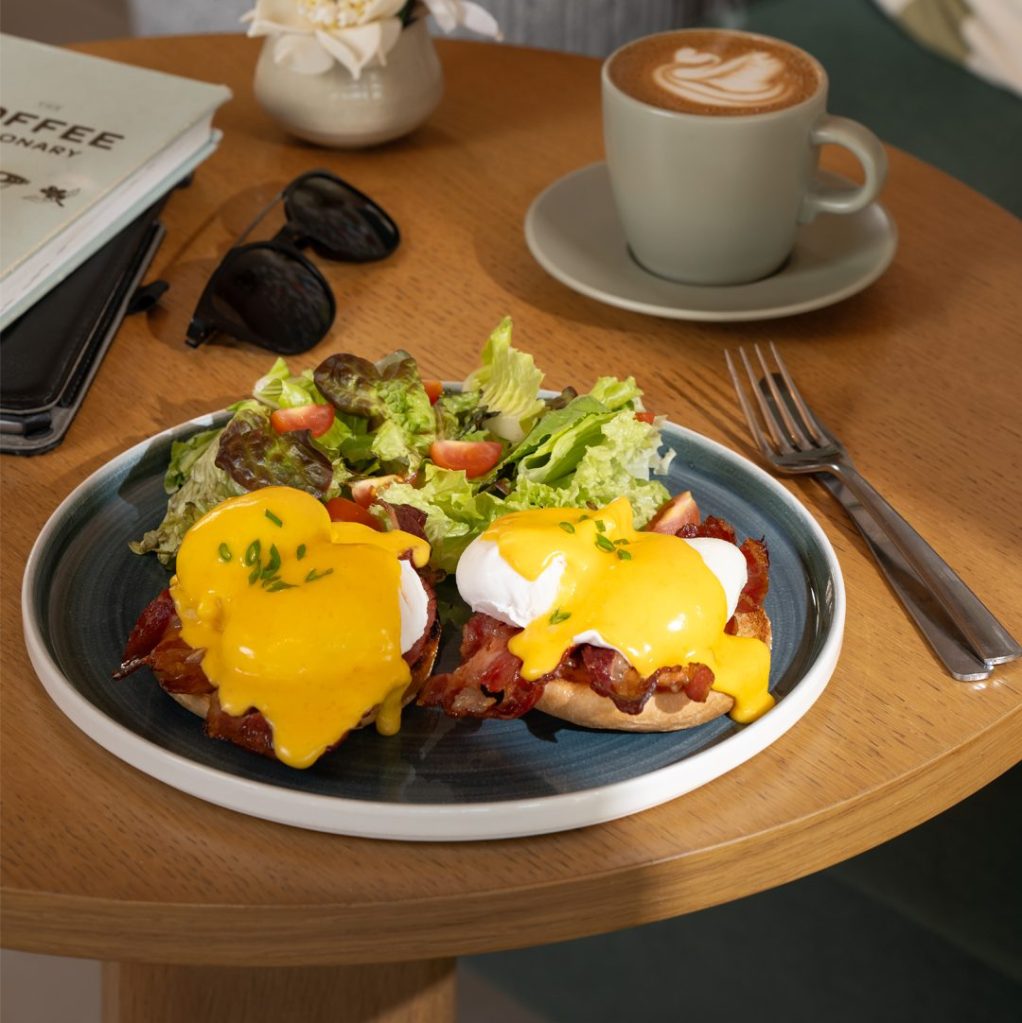 POACHED EGGS & BEEF BACON SERVED ON ENGLISH MUFFIN, TOPPED WITH HOLLANDAISE SAUCE.