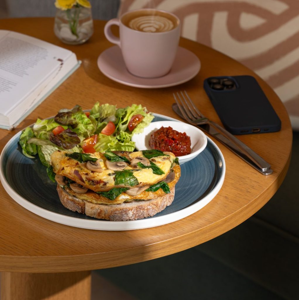 OMELLETE WITH SMOKED CHICKEN, PERSIAN FETA, SUNDRIED TOMATO, MUSHROOMS, BABY SPINACH SERVED ON TOASTED SOURDOUGH WITH A SIDE OF