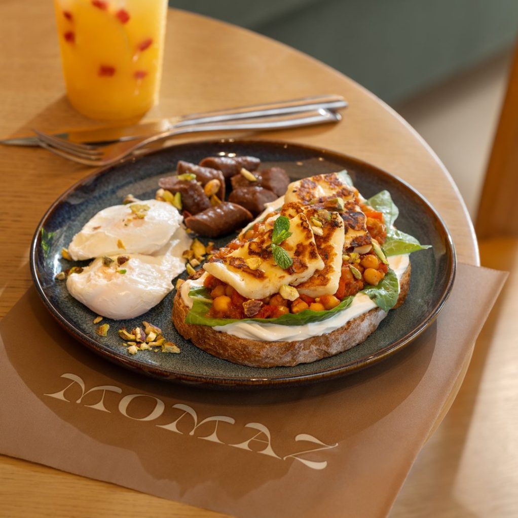 GRILLED HALLOUMI SERVED ON SHAKSHUKA CHICKPEAS, FRESH LABNEH, BABY SPINACH, WITH SIDES OF POACHED EGGS, SMOKED SAUSAGE SPRINKLED WITH PISTACHIO BITS.