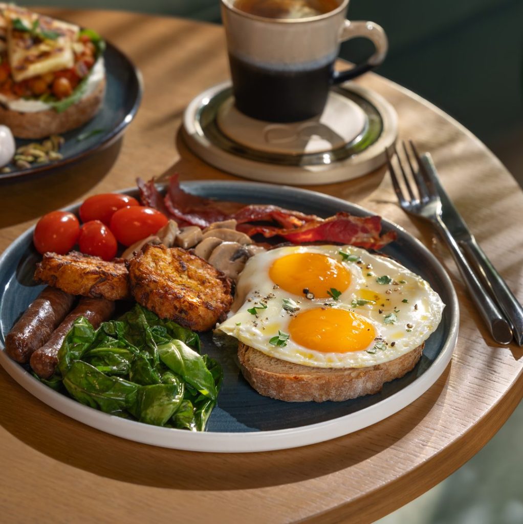 SUNNY-SIDE UP EGGS WITH HASH BROWNS, MUSHROOMS, SMOKED SAUSAGE, CHERRY TOMATOES, BABY SPINACH, SERVED WITH TOASTED SOURDOUGH.