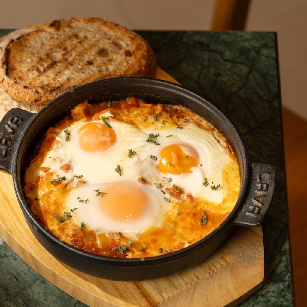 EGGS, SIMMERING TOMATO AND MIXED BELL PEPPER SAUCE, SERVED WITH TOASTED SOURDOUGH.